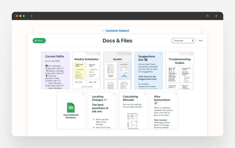 - Files: File uploads and organization with previews and integration with cloud storage platforms.