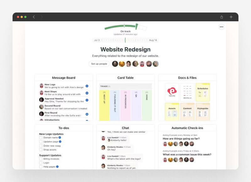 In Basecamp your clients can easily view feedback, decisions, tasks, deadlines, and files in a single organized space. You control what they see, allowing clients to stay informed without feeling overwhelmed. This platform simplifies communication, reduces confusion, and helps everyone remain aligned.