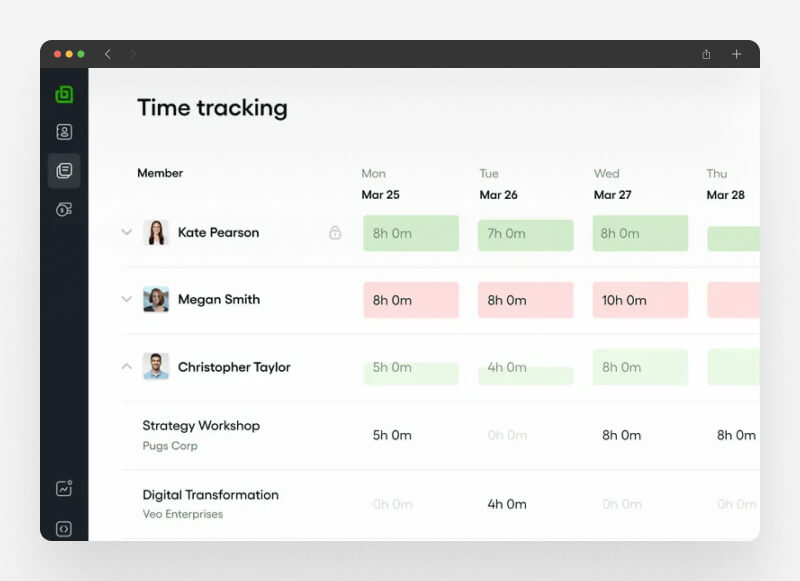 - Time Tracking: Hour logging with a click or manually, enabling quick invoice generation based on tracked time.