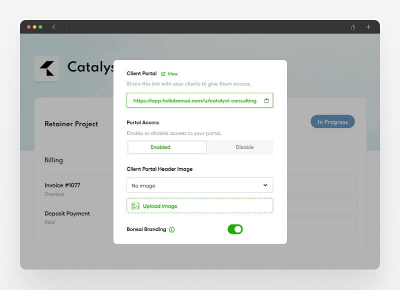 Next, we have Bonsai for project and financial management. Its client portal gives clients a straightforward way to keep track of their projects. Everything from contracts to payments is available in one place, helping clients stay organized and up-to-date without needing to search through emails.