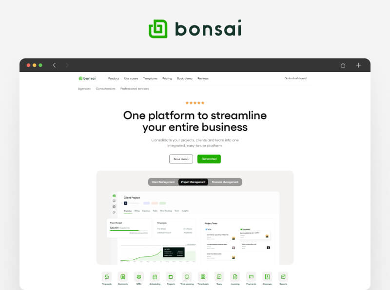 - Bonsai Proposals: Customizable proposals with upselling options, client notifications for views, and one-click approval.